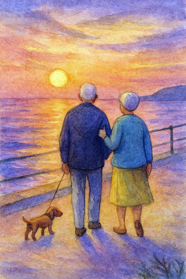 anziana a passeggio sul lungomare con il loro cane a guinzaglio.