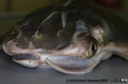 La bocca è subterminale e con grandi denti piatti. Nella mascella superiore vi sono 9 file di denti, in quella inferiore 7. Ha cinque paia di branchie.