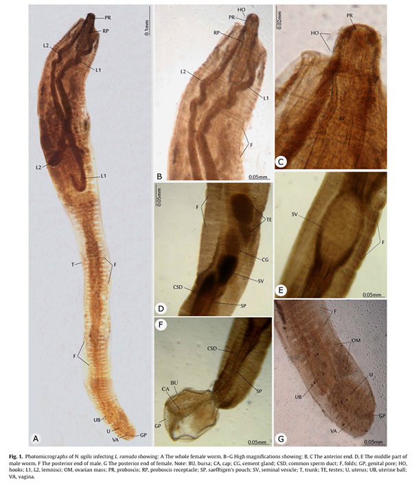 Neoechinorhynchus (Neoechinorhynchus) agilis (Rudolphi, 1819) Van Cleave, 1916 Il metasoma è cilindrico, la proboscide, relativamente corta, è lunga quanto larga, munita di una serie di uncini disposti in tre cerchi da sei uncini, con le prime file di uncini più grandi. I testicoli ovali allungati si trovano uno dietro l'altro nel terzo medio del corpo. Le femmine dispongono di un gran numero di sfere ovariche all'interno del sacco legamentoso. Le uova fusiformi contengono l'embrione. Le caratteristiche morfologiche degli esemplari, la forma e le dimensioni della proboscide, il basso numero e la posizione delle spine sulla proboscide collocano chiaramente questa specie all'interno del genere Neoechinorhynchus.