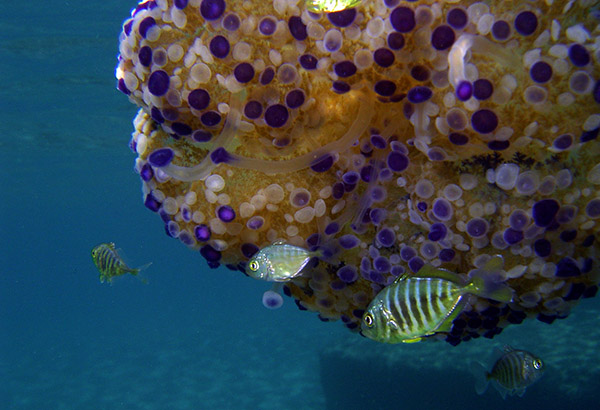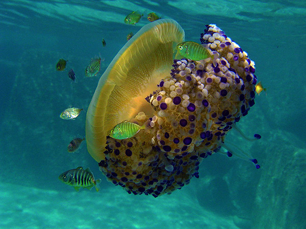 Cotylorhiza tuberculata (Macri, 1778) Scifomedusa con ombrella piatta, con rialzo centrale a cupola e senza tentacoli sul margine. Presenti sedici lobi che si scompongono in un centinaio di piccoli lobi e 8 ropali. Colore verde-bruno per presenza di alghe simbionti. Sugli otto tentacoli vi sono rigonfiamenti violacei. A volte si presenta in branchi enormi. Quasi sempre è in compagnia di avannotti di varie specie (boga, sauri, fieti, ecc.).