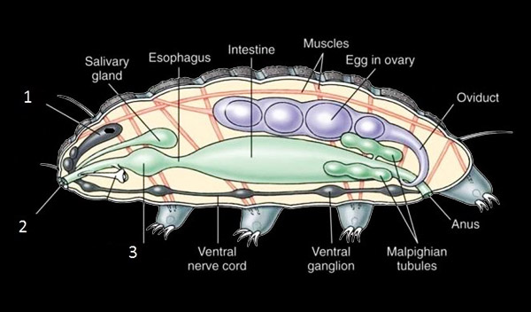 quattro metameri, ciascuno dotato di un paio di zampe con 4–8 unghie)